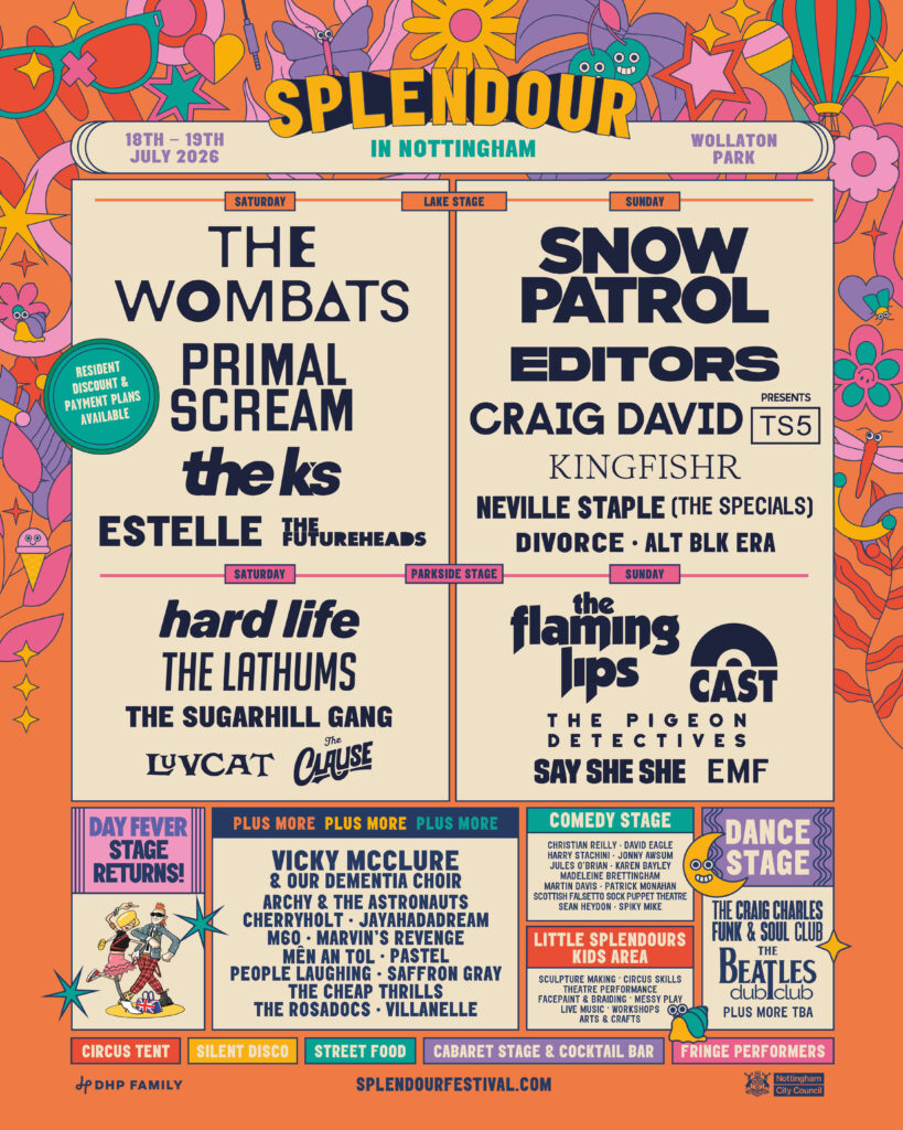 Nottingham’s biggest outdoor music event, Splendour Festival, returns to Wollaton Park on July 18-19, 2026 with a blockbuster lineup that blends indie-rock icons, modern guitar heroes, and chart-topping anthems. Headliners Snow Patrol and The Wombats lead the charge, now joined by rock heavyweights Primal Scream, Editors, The K’s, The Flaming Lips, Cast, Hard Life, The Lathums, The Pigeon Detectives, The Futureheads, The Clause, Pastel, M60, and more.