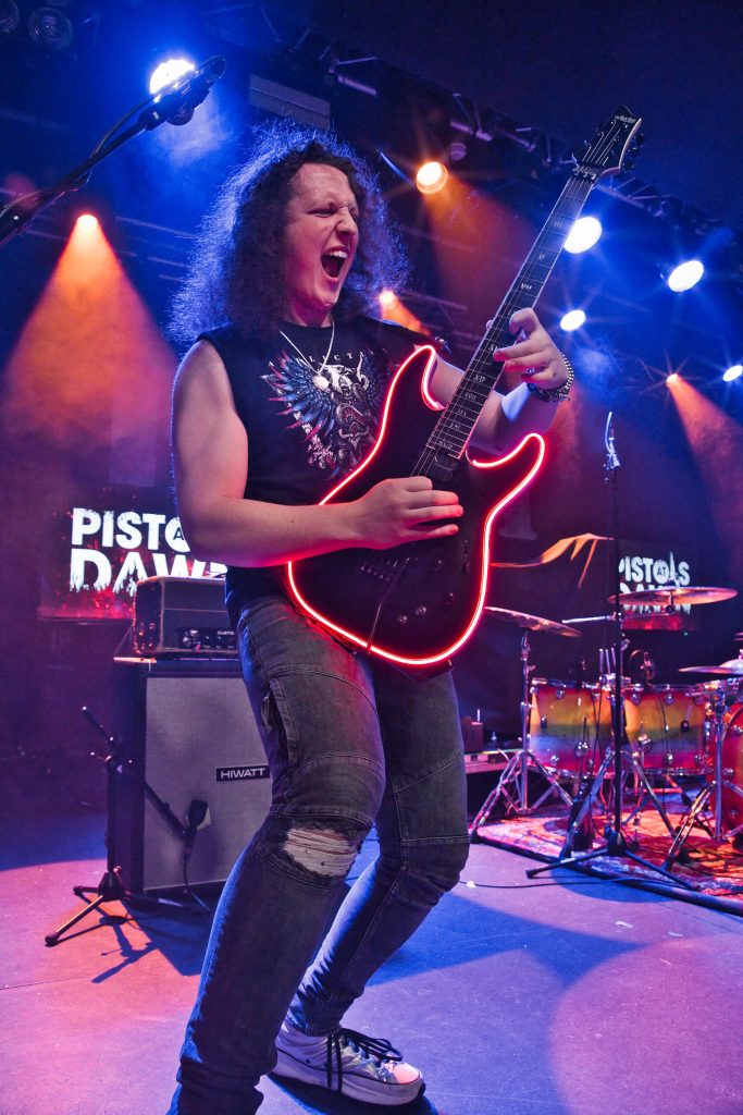 First up it’s Pistols at Dawn, all the way from Atlanta, Georgia. The first thing we hear is a ripping guitar solo coming over the speakers with no band on stage. Then, out steps the guitarist with a guitar lit up with a red border.
