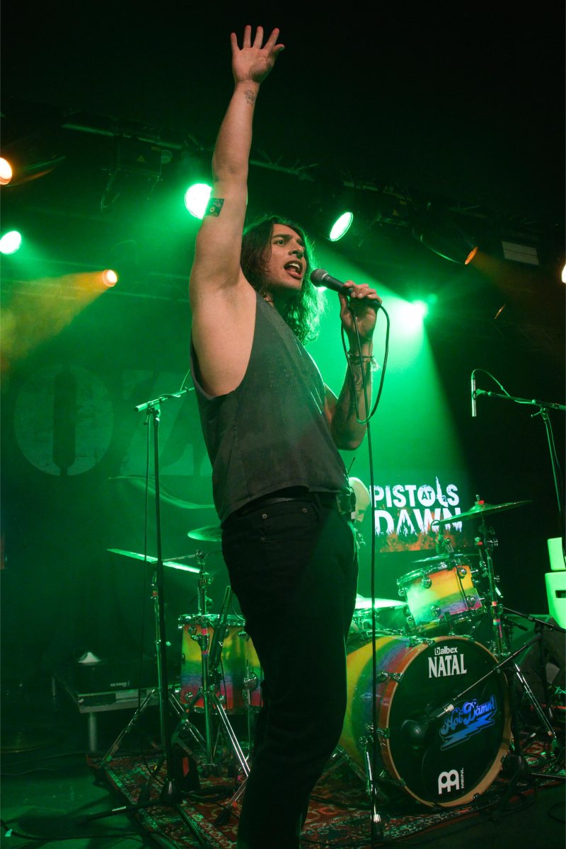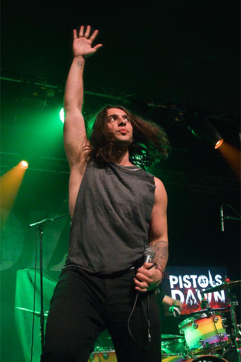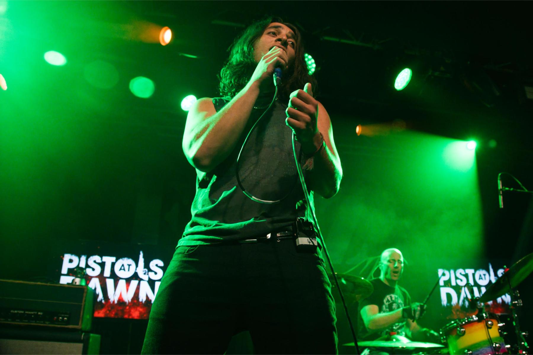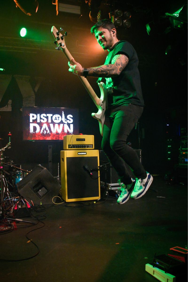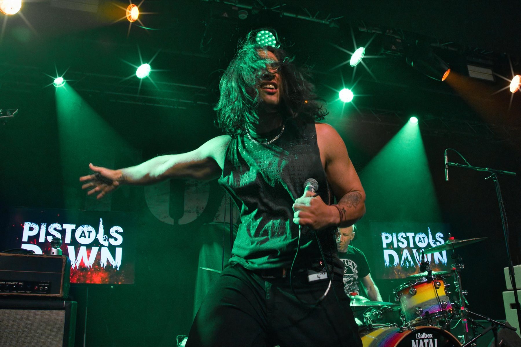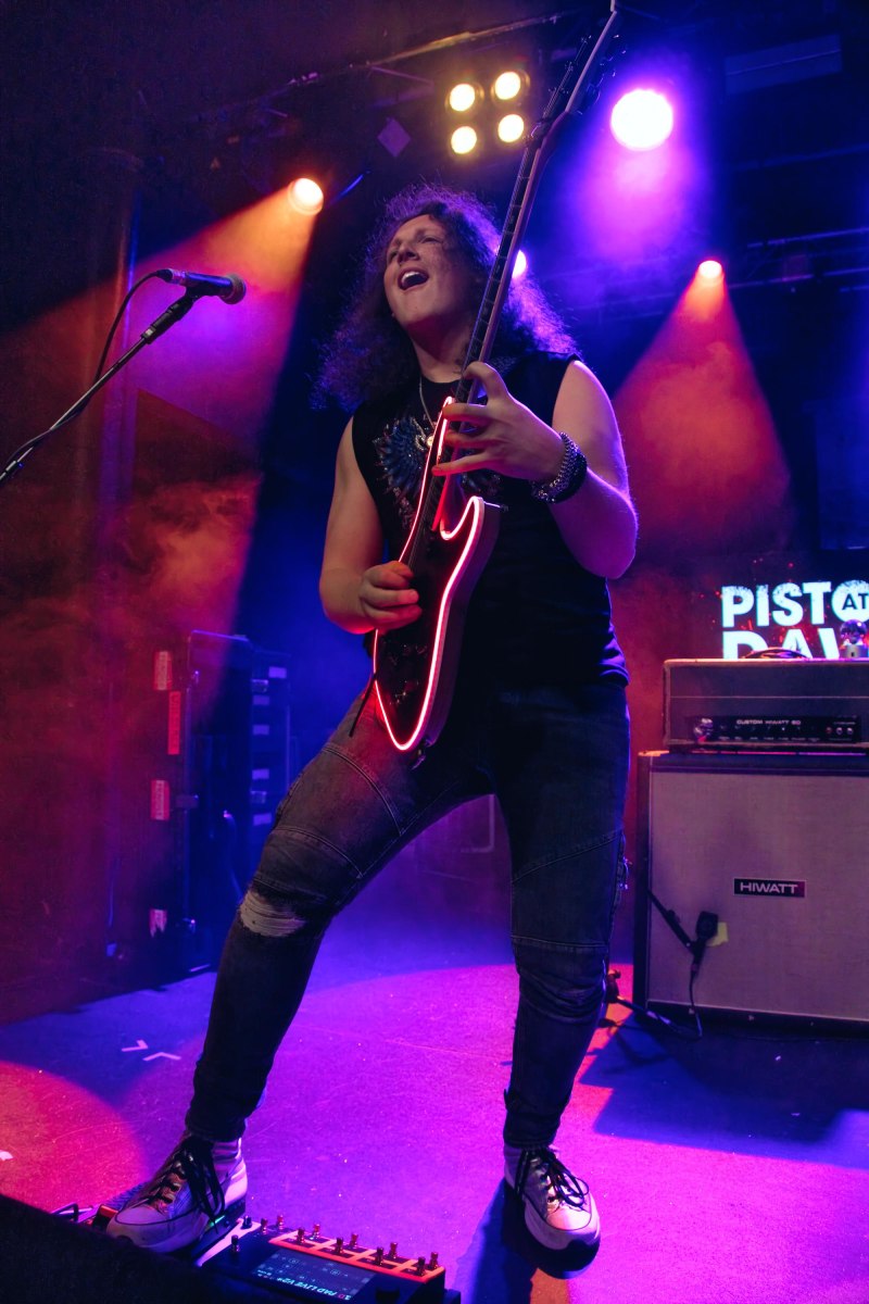 First up it’s Pistols at Dawn, all the way from Atlanta, Georgia. The first thing we hear is a ripping guitar solo coming over the speakers with no band on stage. Then, out steps the guitarist with a guitar lit up with a red border.