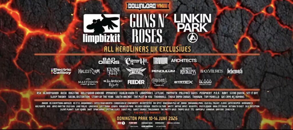 Booker Kamran Haq nailed the hype in his post-drop IG Live: “This is nu-metal’s revenge, rock’s revival, and Download’s boldest swing yet – a five-day pulse that’ll echo for years.” GNR returns for a hat-trick (after 2006/2018), Linkin Park unleashes post-reunion fire (their first DL headline since 2004), and Limp Bizkit – original 2003 headliners who bailed pre-fest – finally claim the throne with Fred Durst’s meme-fueled chaos. The undercard? A genre-bending feast from deathcore crushers to pop-metal wildcards.