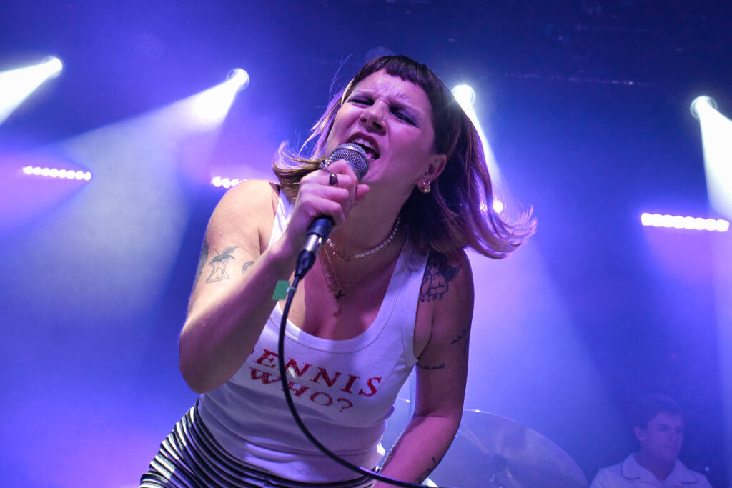 From the moment they launched into the set, the pace was relentless. Opening with the strutting confidence of ‘Gok Wan’ a track that sets their tone of high-fashion irreverence against brutalist punk riffs and the band was instantly dialled in. Vocalist Sarah Harvey, a whirlwind of sardonic energy, wasted no time connecting with the sweaty throng, while guitarists Meg Fretwell and Romi Lawrence carved out hook after undeniable hook, expertly supported by bassist Emily Smith and drummer Nick Doherty-Williams.