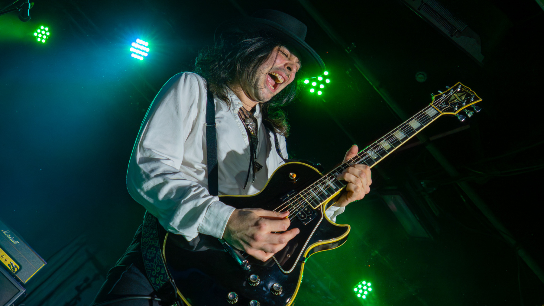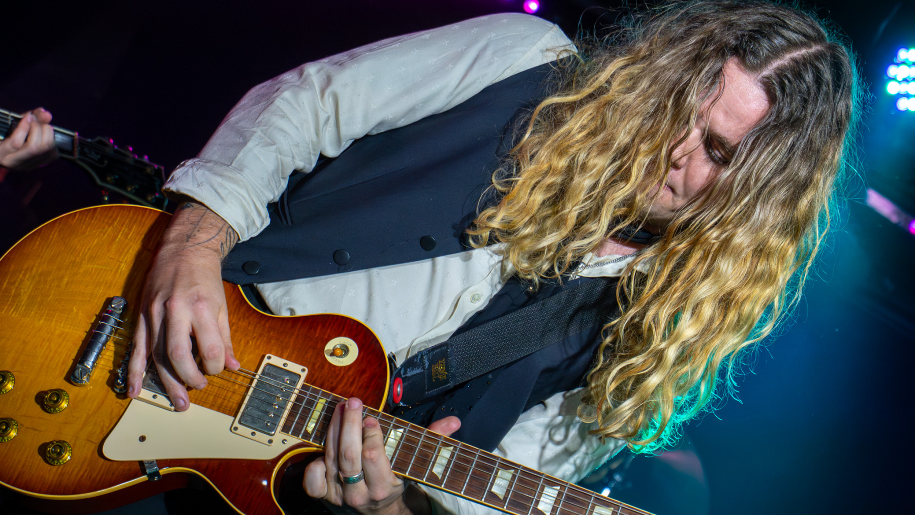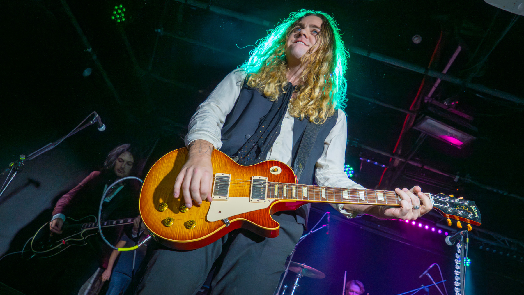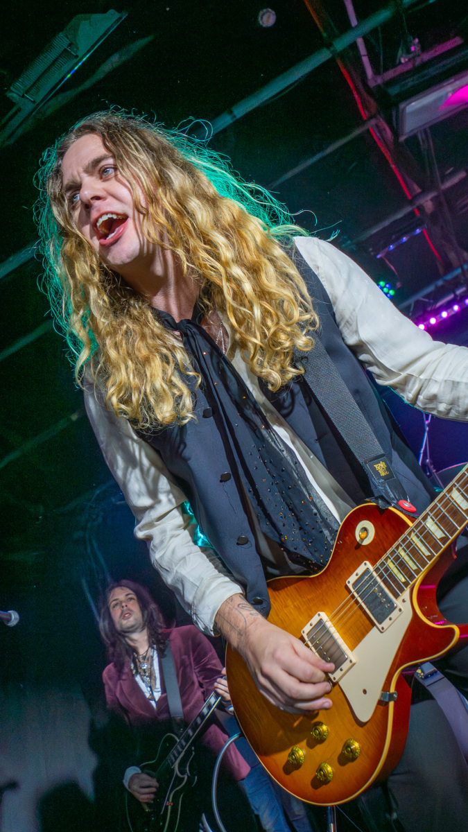 Adam Slack strolls onto the stage carrying a limited edition Billy Gibbons ‘Pearly Gates’ signature guitar, wearing a white shirt and grey waistcoat. Alongside Matt Peach, ‘The Bangers’ are Natt Webb on drums and Roan Brandt on bass who have shared stages with Adam since they were in the boyhood local bands of Raw and Small Talk.