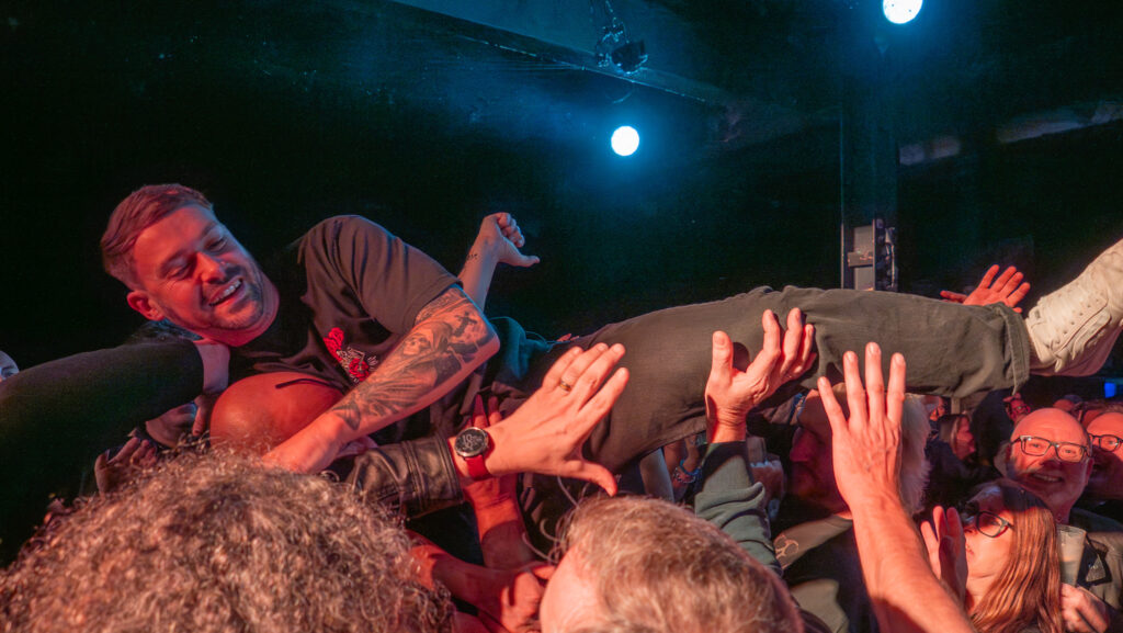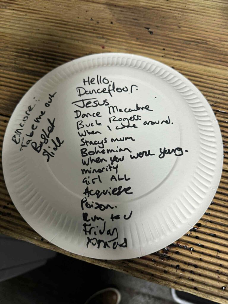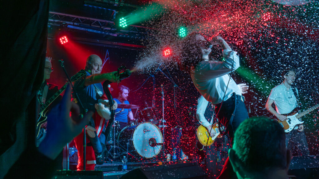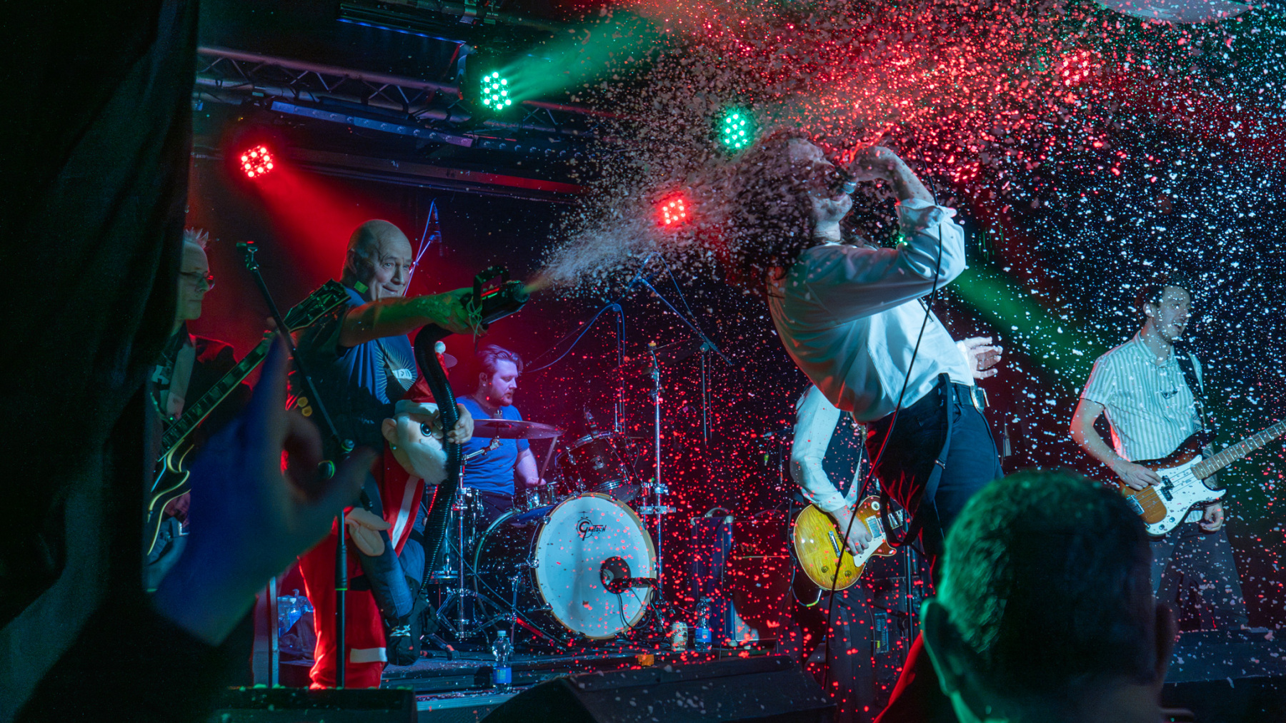 A delightfully festive version of Wet Wet Wet’s Love Is All Around – “come on and let it snow” was followed by Matt’s own Christmas song Rock ‘n’ Roll Xmas with his dad Nicholas on guest guitar and Oolay Stone ‘filling in for his mum’ on drums. The obligatory Dave Ford snow machine covered most of the front five rows at this point.